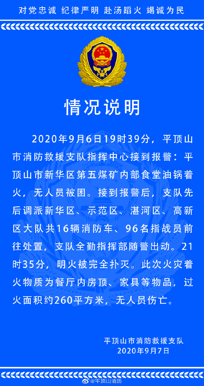 據河南省平頂山市消防救援支隊微博消息,2020年9月6日19時39分,平頂山市消防救援支隊指揮中心接到報警:平頂山市新華區第五煤礦內部食堂油鍋著火,無人員被困。接到報警後,支隊先後調派新華區、示範區、湛河區、