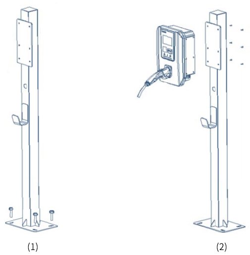 步驟:1.先用螺絲固定住底柱,如圖1所示;2.通過背板將M6螺絲將充電樁固定在立柱外部,如圖2所示